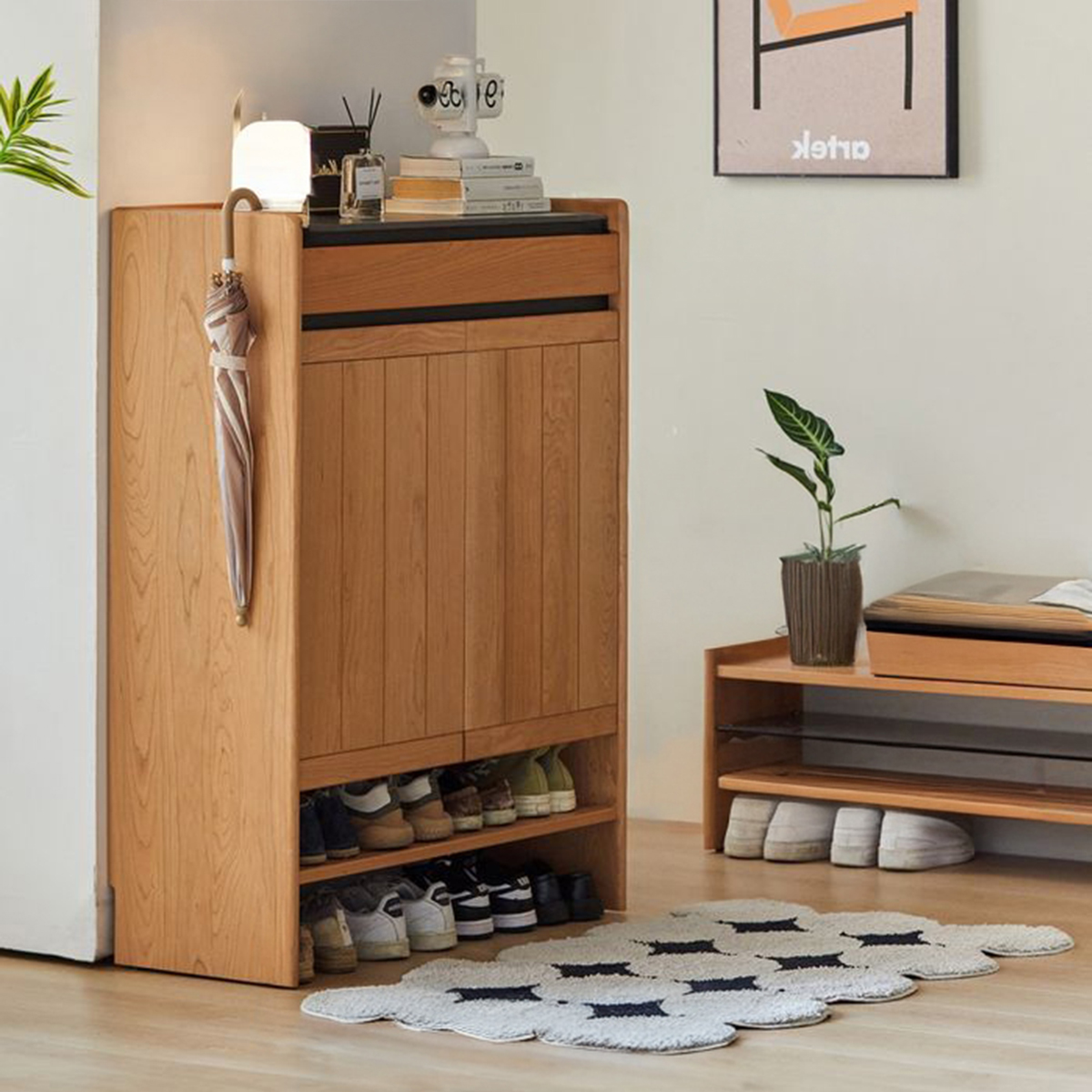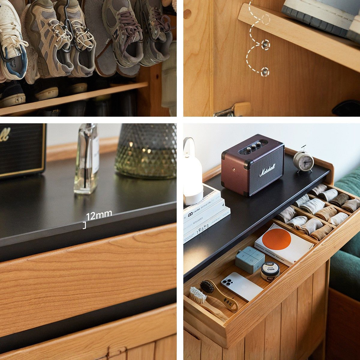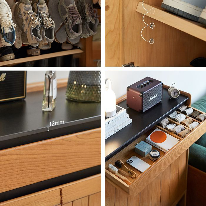- 商品細節:精選櫻桃木實木打造,木紋溫潤,頂部岩板耐磨易打理,超薄櫃體適合各類玄關空間,兼顧大容量收納與日式居家美學。