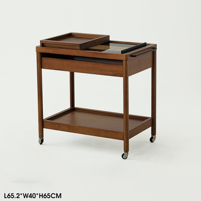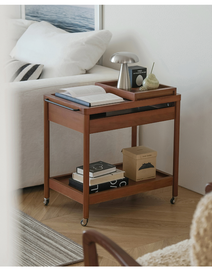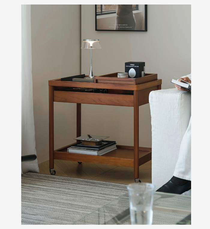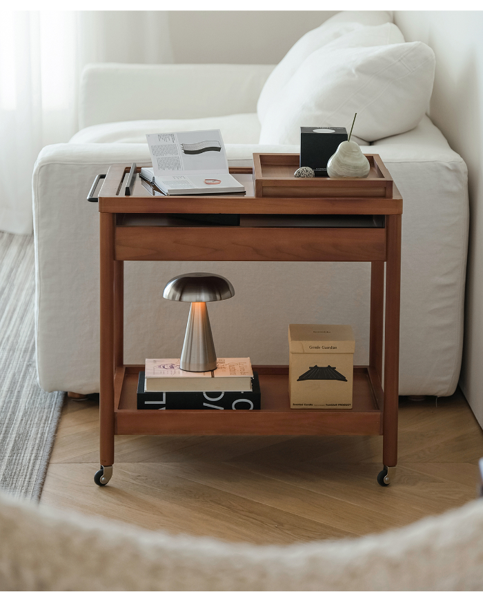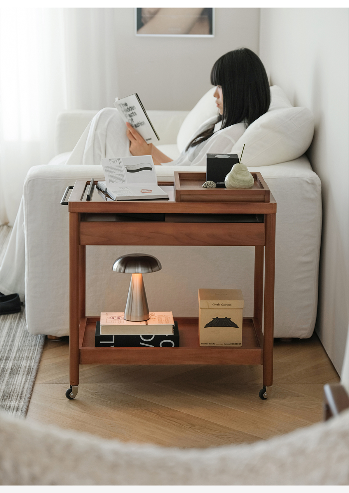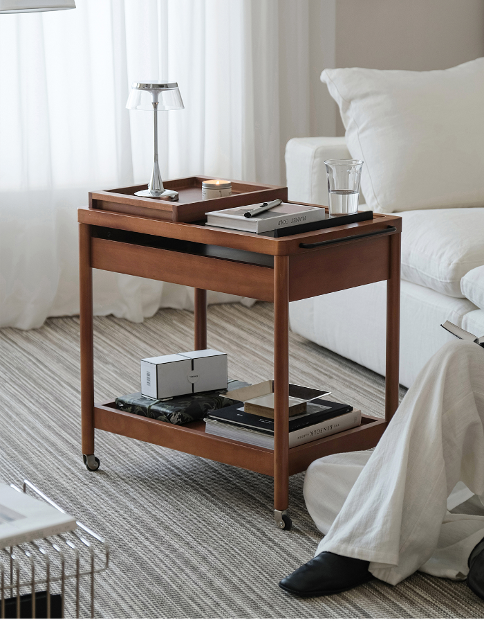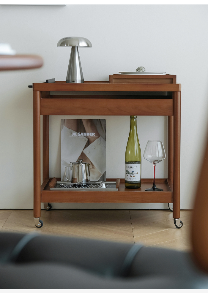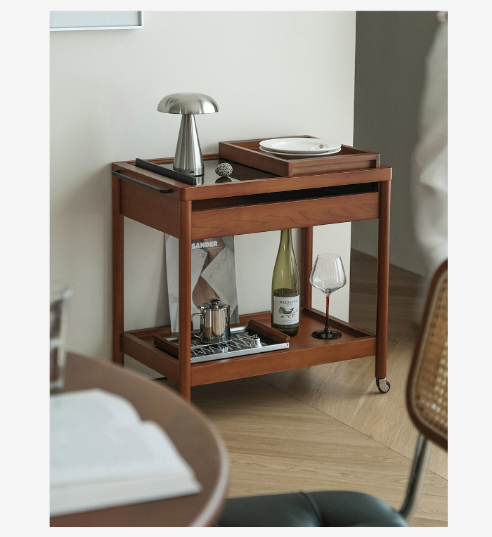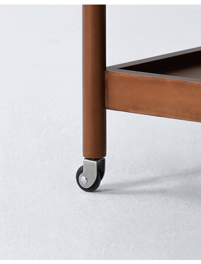 • 商品細節 : 這款小推車採用優質實木打造,結合中古與北歐設計風格。配備靜音萬向輪,移動靈活且具備兩層大容量收納空間,適合作為客廳邊幾或沙發旁置物架使用。