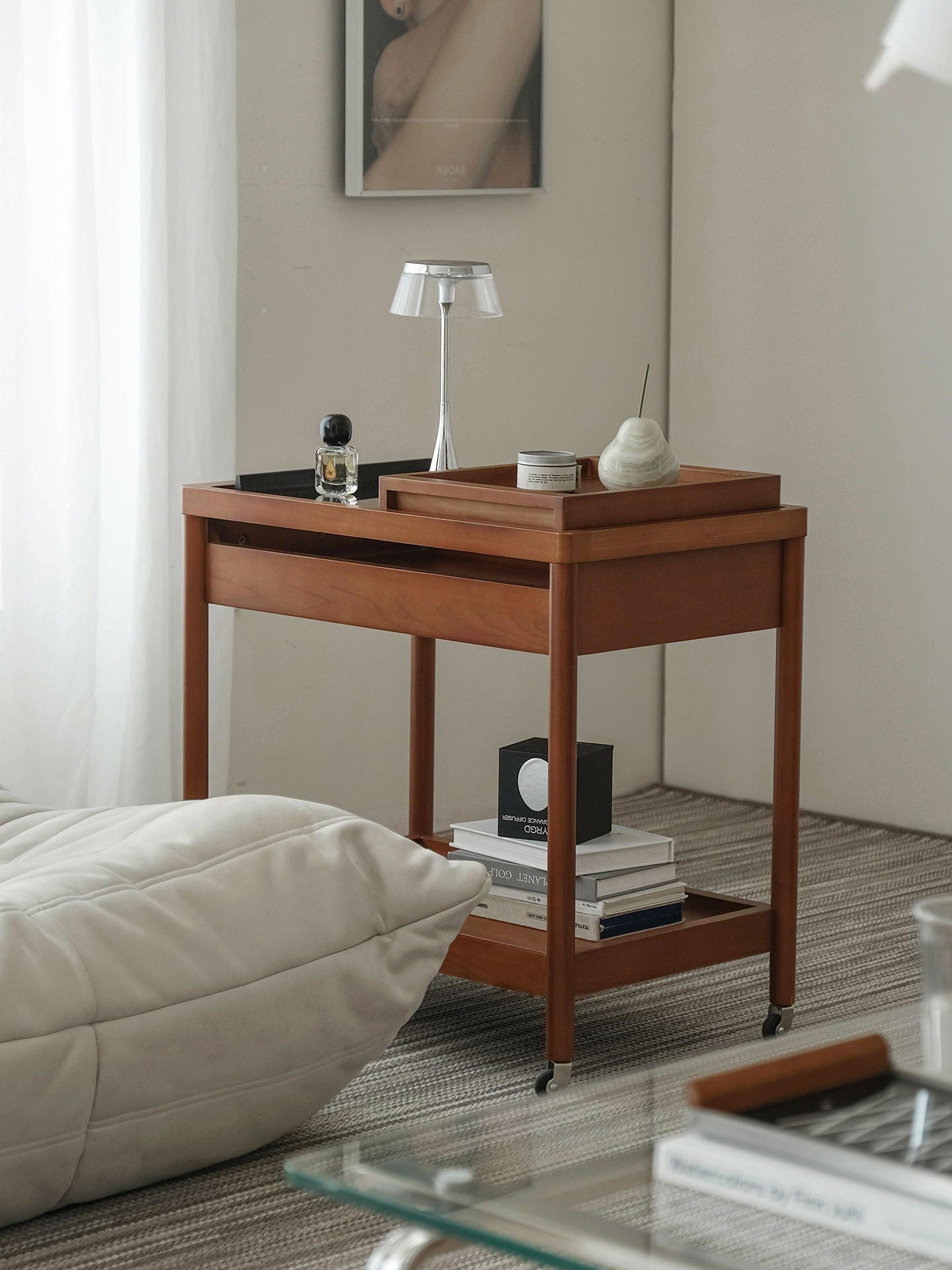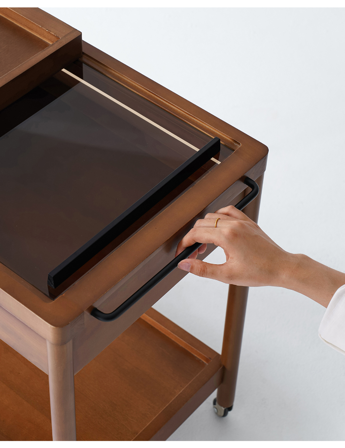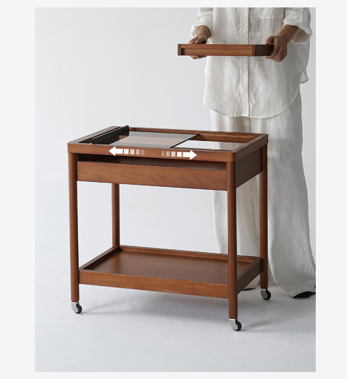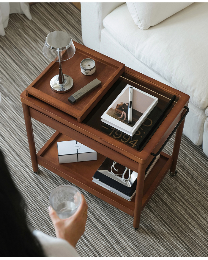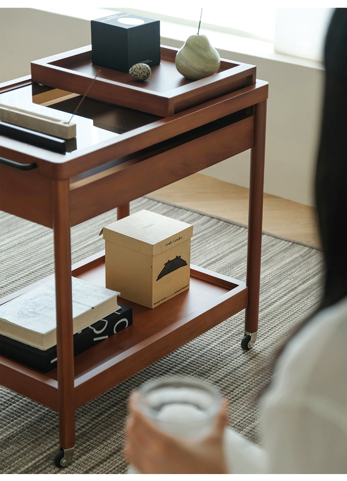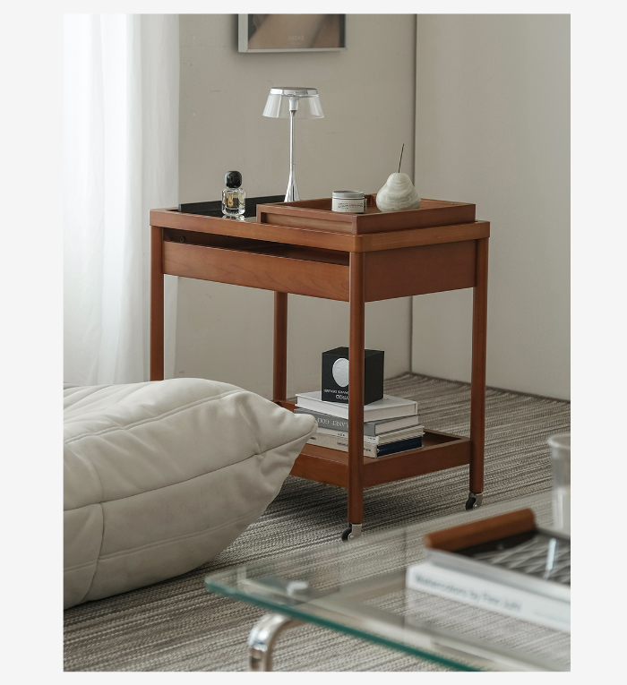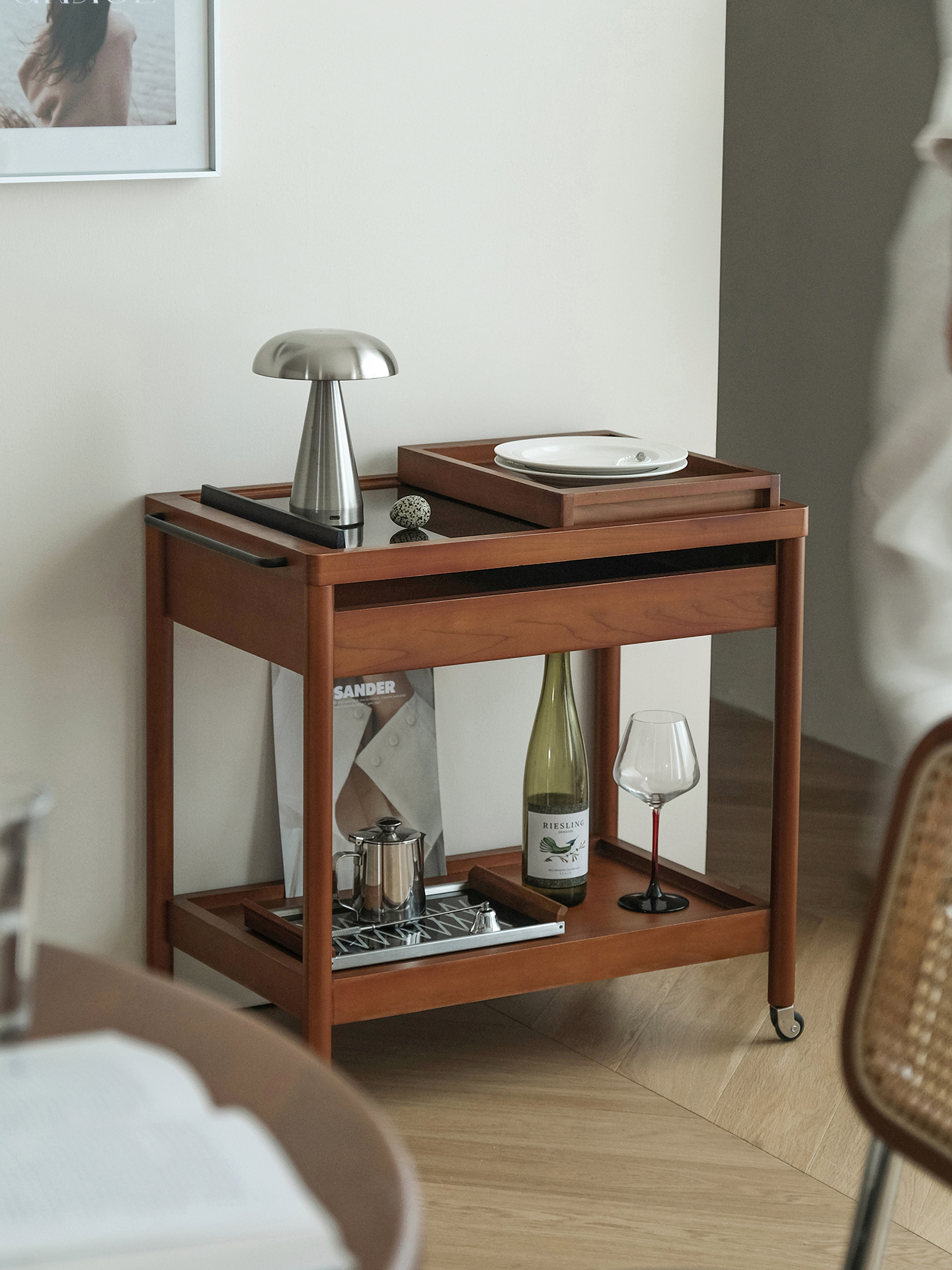 • 商品細節 : 這款小推車採用優質實木打造,結合中古與北歐設計風格。配備靜音萬向輪,移動靈活且具備兩層大容量收納空間,適合作為客廳邊幾或沙發旁置物架使用。